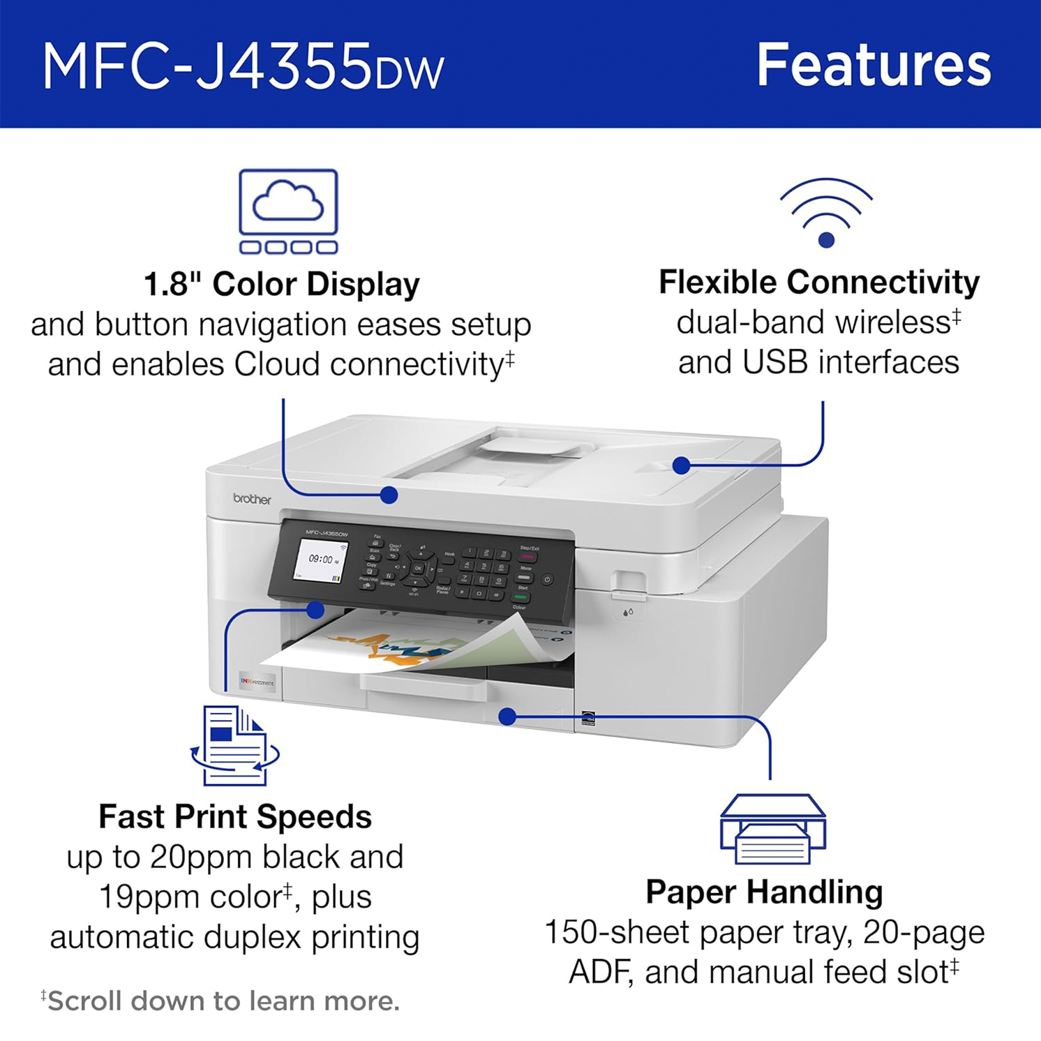 • PRODUCTIVITY-FOCUSED FEATURES: Automatic duplex (2-sided) printing, 150-sheet paper tray, 20-page single-sided automatic document feeder (ADF), 1-sheet manual feed slot(4). Prints at fast speeds up to 20 pages per minute (ppm) black/19 ppm color(5).