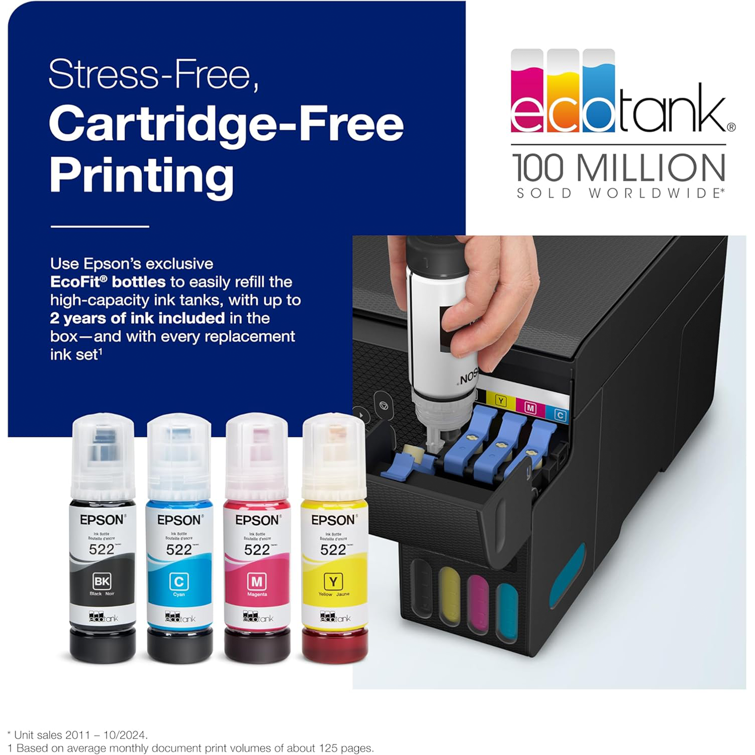 Epson strongly recommends the use of genuine ink to ensure optimal print quality and performance. Use of non-genuine ink could cause damage not covered under the printer’s ltd. wnty. | 1. Actual savings and costs will vary considerably based on print tasks, print volumes and usage conditions. Savings and cost per ISO page are based on the cost of replacement ink bottles and the cost of enough standard cartridges to achieve the total page yields of the bottles using the MSRP (USD) and yields for Epson standard-capacity ink cartridges for similarly featured Epson consumer inkjet printers as of March 2024. | 2. Individual cartridges estimate based on print yields of an included or replacement set of black and color ink bottles as compared to Epson standard-capacity ink cartridges for similarly featured printers as of March 2024. | 3. Part of the ink from the included bottles is used for initial setup; yields are lower than those of replacement ink bottles. Replacement and included ink bottle yields based on the ISO/IEC 24712 pattern with Epson’s methodology. Actual ink yields will vary considerably for reasons including images printed, print settings, temperature and humidity. Yields may be lower when printing infrequently or predominantly with one ink color. All ink colors are used for printing and printer maintenance, and all colors must be available for printing. For more information, visit www.epson.com/inkinfo | 4. Based on average monthly document print volumes of about 125 pages. | 5. See www.epson.com/voice for device compatibility. Epson Connect™ account and voice-activated account registration required. | 6. Most features require an Internet connection to the printer, as well as an Internet- and/or email-enabled device. For a list of Epson Connect enabled printers and compatible devices and apps, visit www.epson.com/connect | 7. Requires Epson Smart Panel app download. Data usage fees may apply.