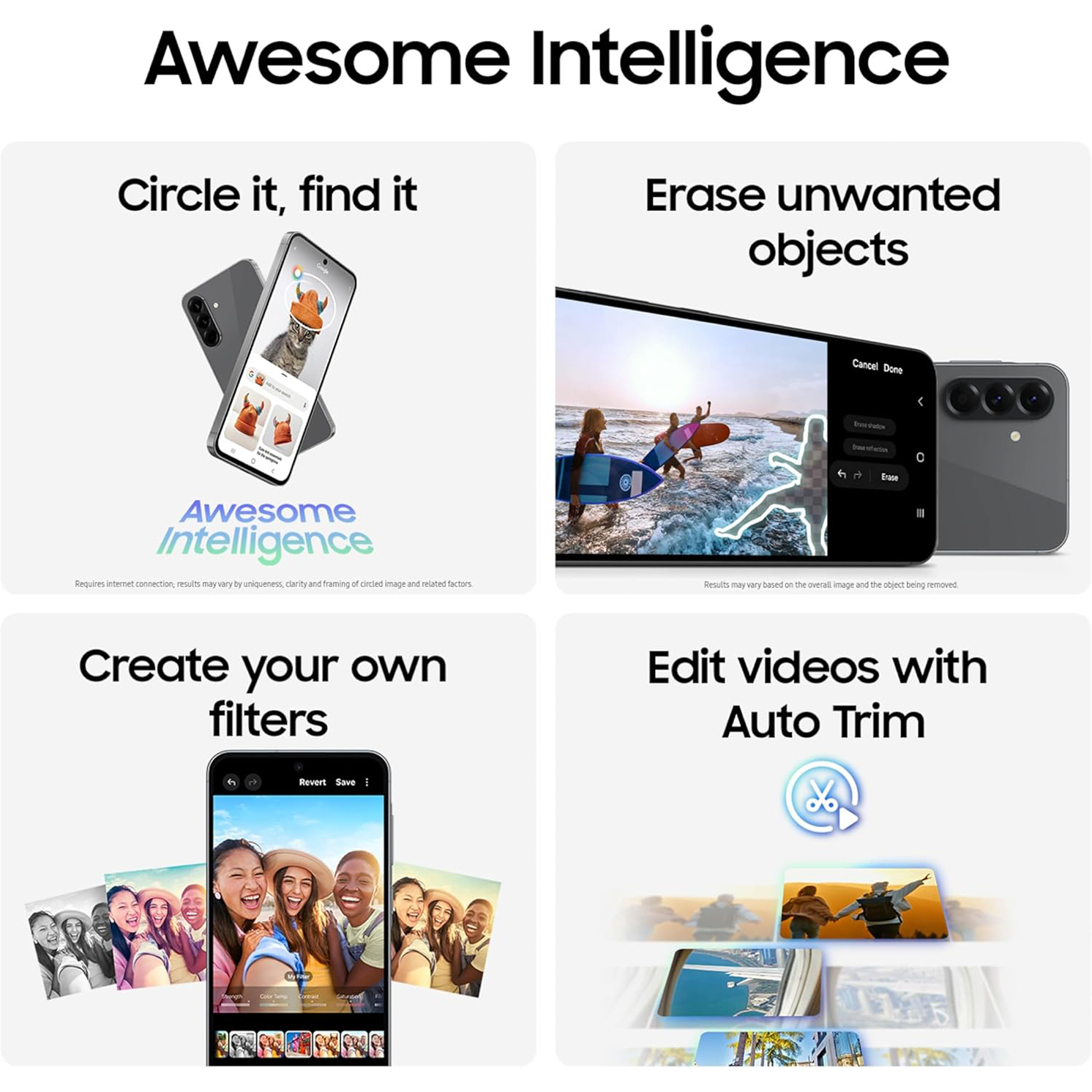 • AWESOME MADE EASY: The Awesome Intelligence of Galaxy A56 is like having a suite of superpowers. You can find answers quicker using Circle to Search with Google.7 Plus, get the photos and videos you want with tools like Best Face and Auto Trim .